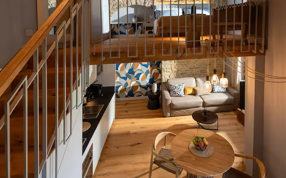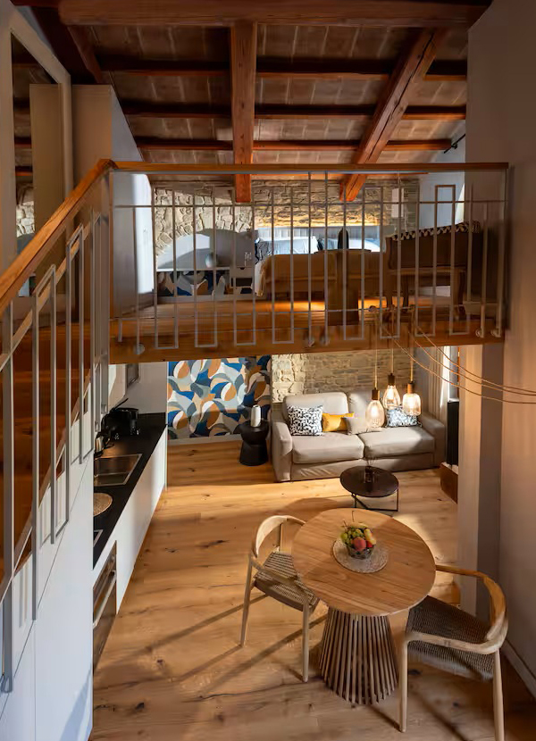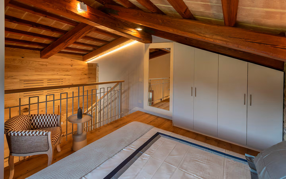 La camera da letto soppalcata è un piccolo capolavoro di design, con un letto sospeso e sotto illuminato che regala un tocco di magia. Armadio e comodini sono a disposizione per garantire il massimo comfort e funzionalità.