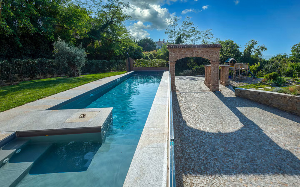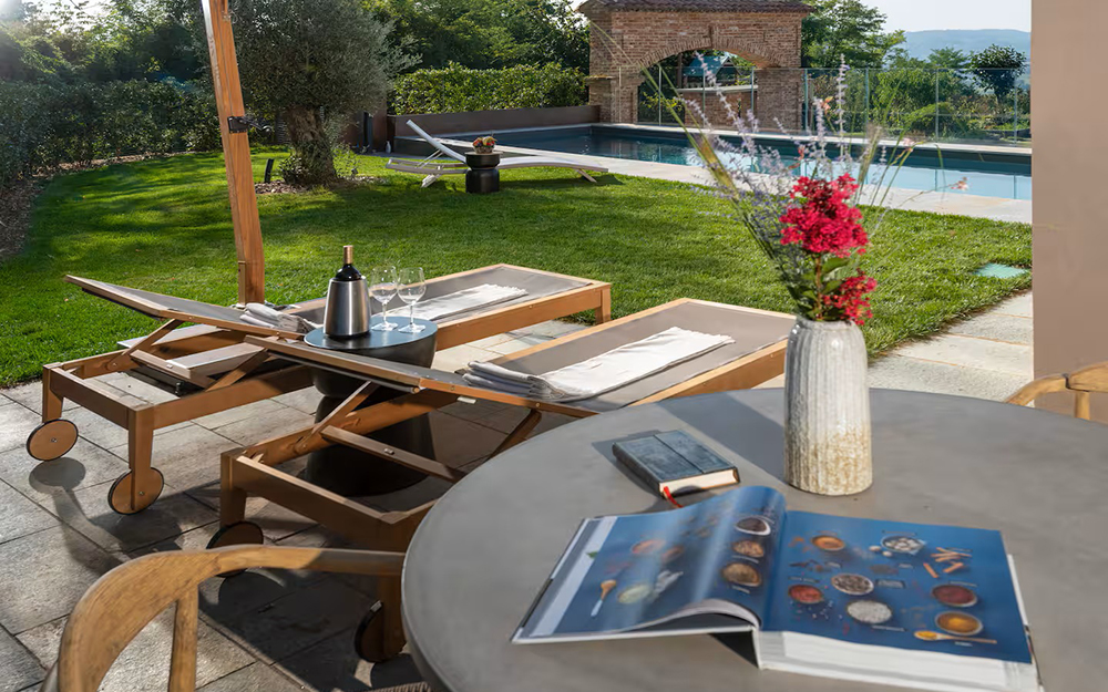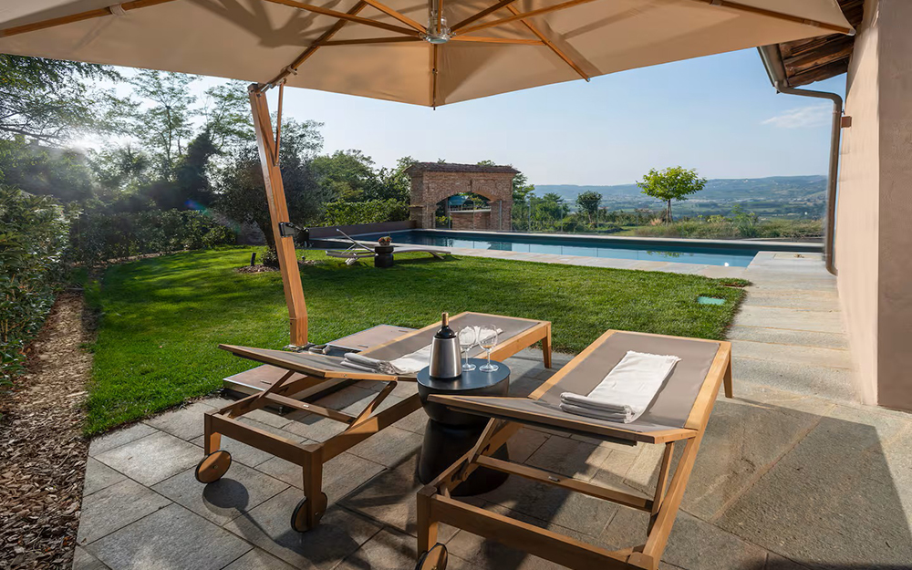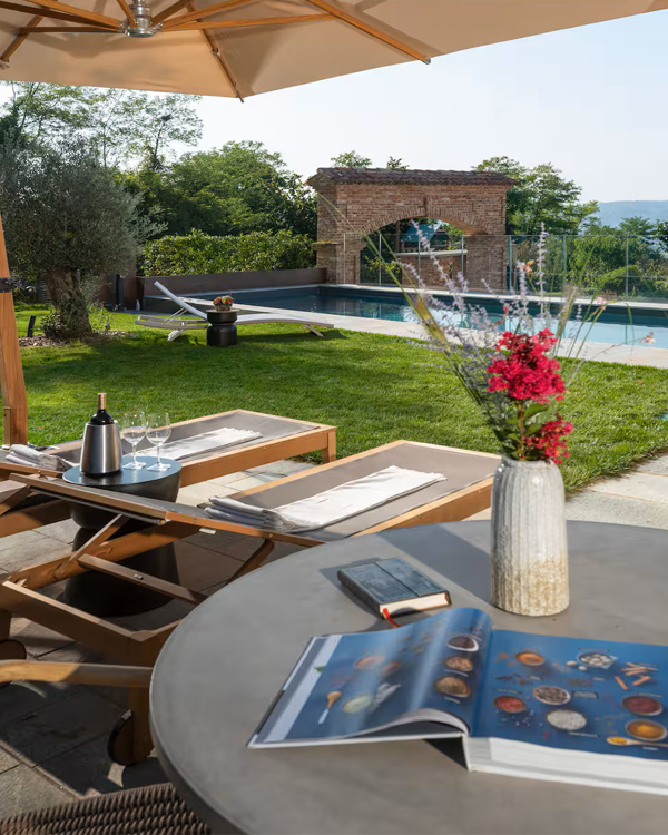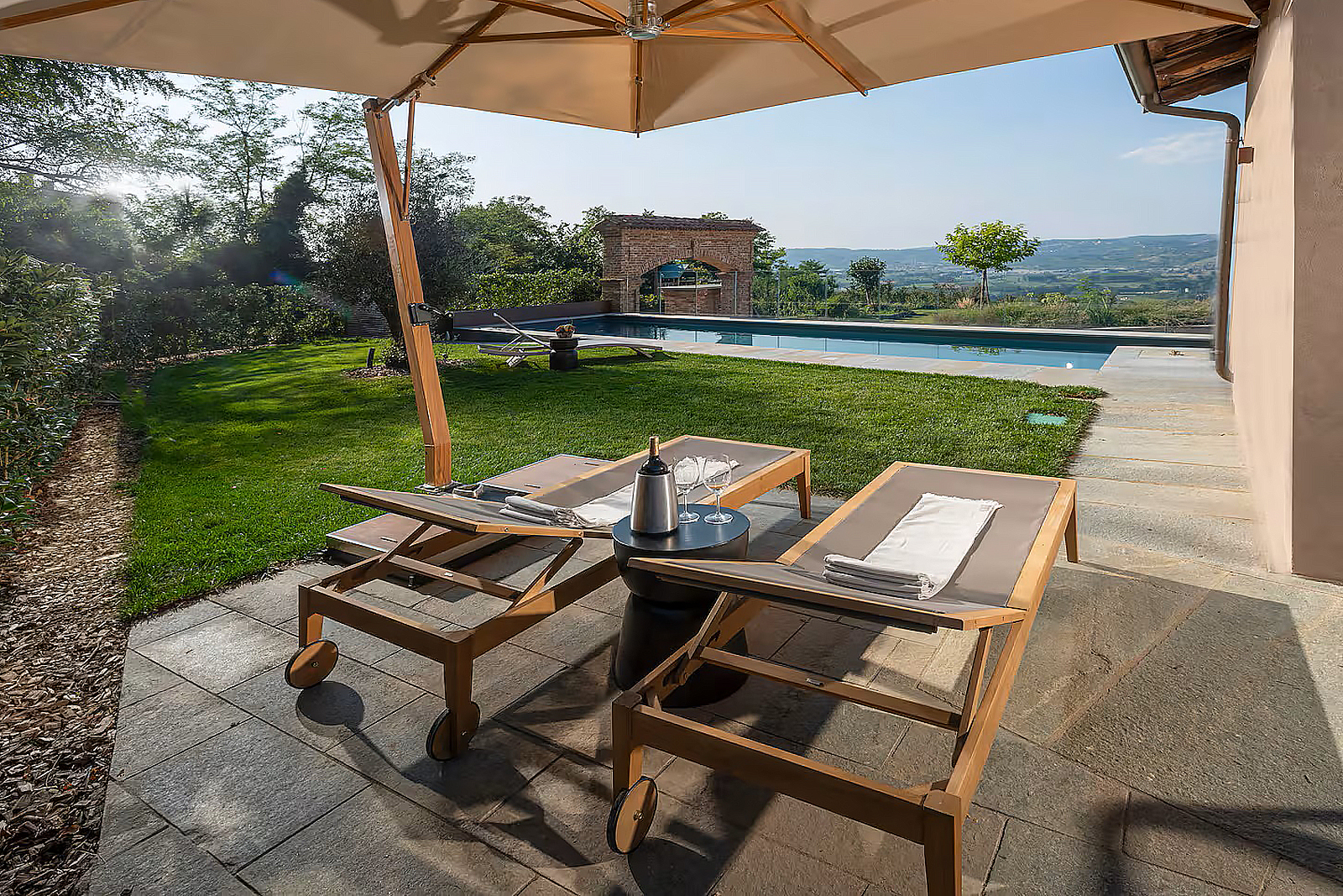 Uno degli aspetti più apprezzati della proprietà è la splendida piscina a sale, con vista mozzafiato sulle Langhe e sul Monviso. Ideale per un tuffo rigenerante in qualsiasi stagione. Il giardino privato è perfetto per godersi il sole, con sdraio, ombrellone e un tavolo con sedie per cene all’aperto.