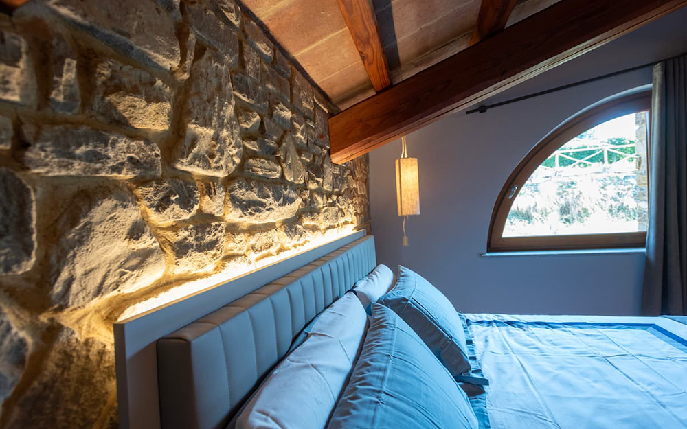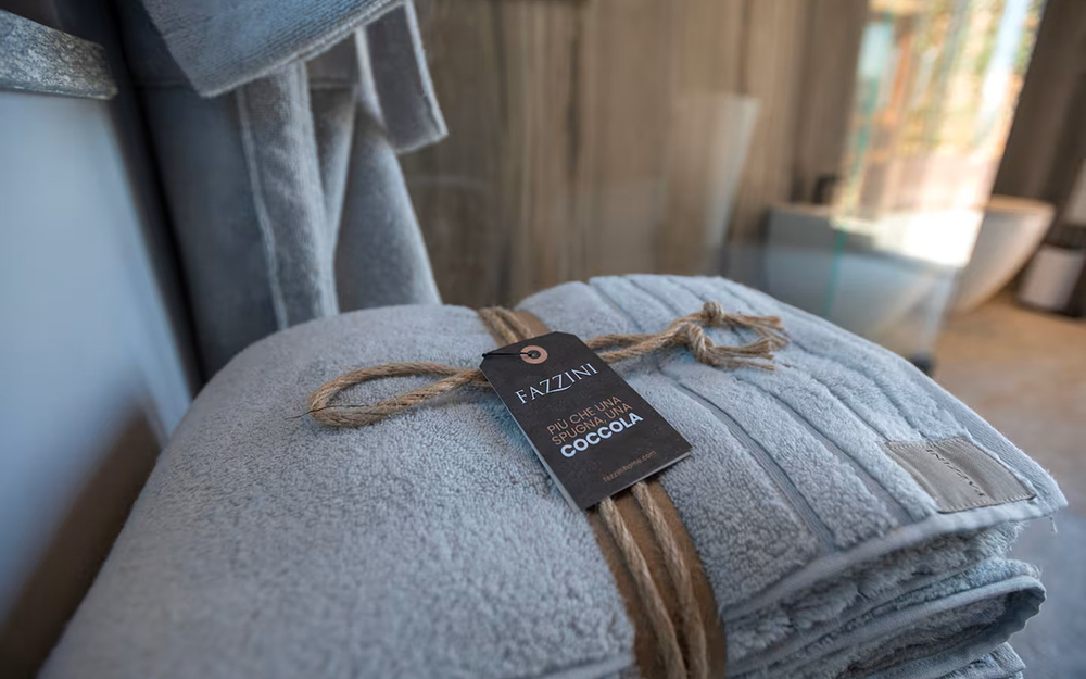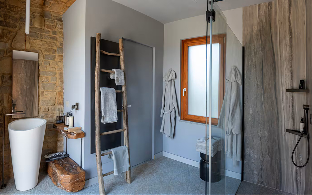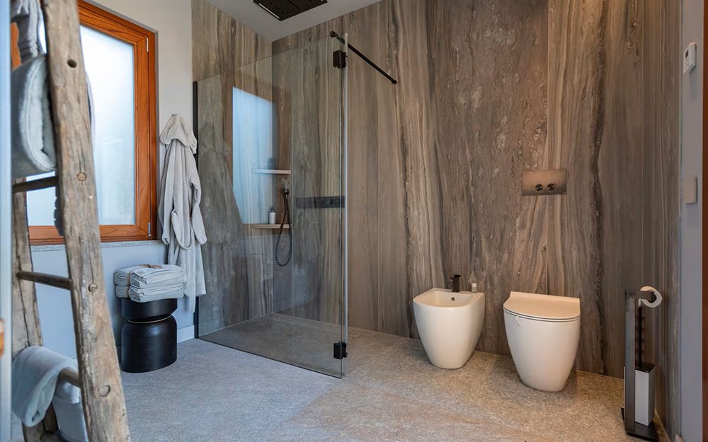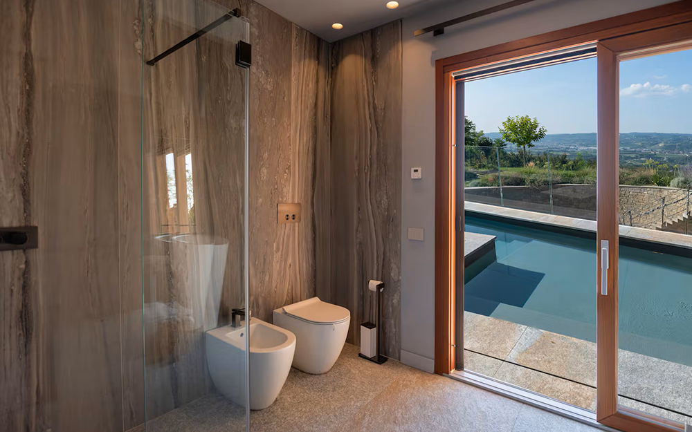 Il bagno è un’oasi di benessere, dotato di una doccia con cromoterapia a tetto per un’esperienza rilassante e rigenerante. Completano il bagno moderni sanitari, tra cui WC, bidet e un lavandino dal design esclusivo, con una vista affascinante sulla piscina.