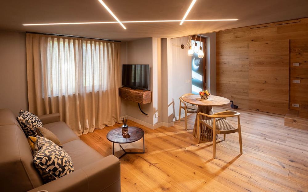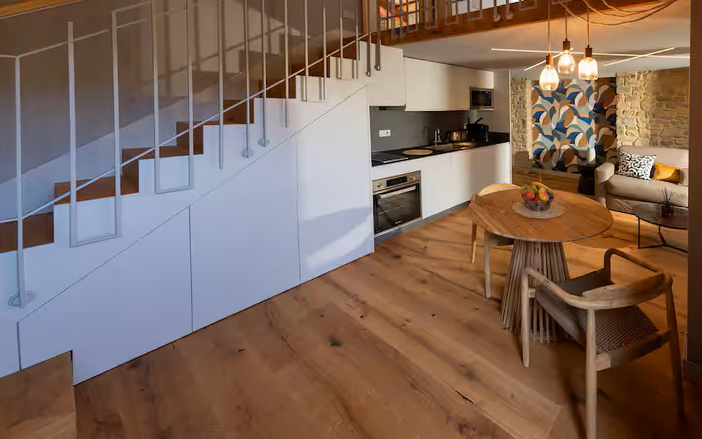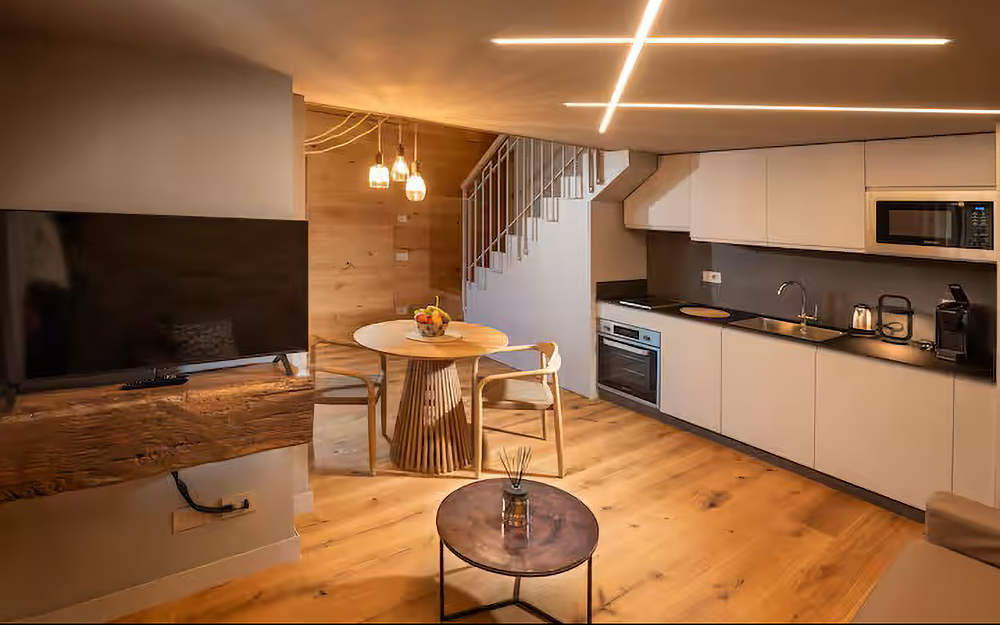 L'appartamento offre un'accogliente zona giorno con divano letto, ideale per rilassarsi davanti alla smart TV. La cucina è completamente attrezzata e dispone di frigorifero, lavastoviglie, macchina del caffè, piano cottura a induzione a 2 fuochi, microonde, forno, bollitore e tostapane, perfetti per chi ama cucinare anche in vacanza. Il tavolo da pranzo rotondo in legno chiaro completa lo spazio, creando un’atmosfera calda e conviviale.