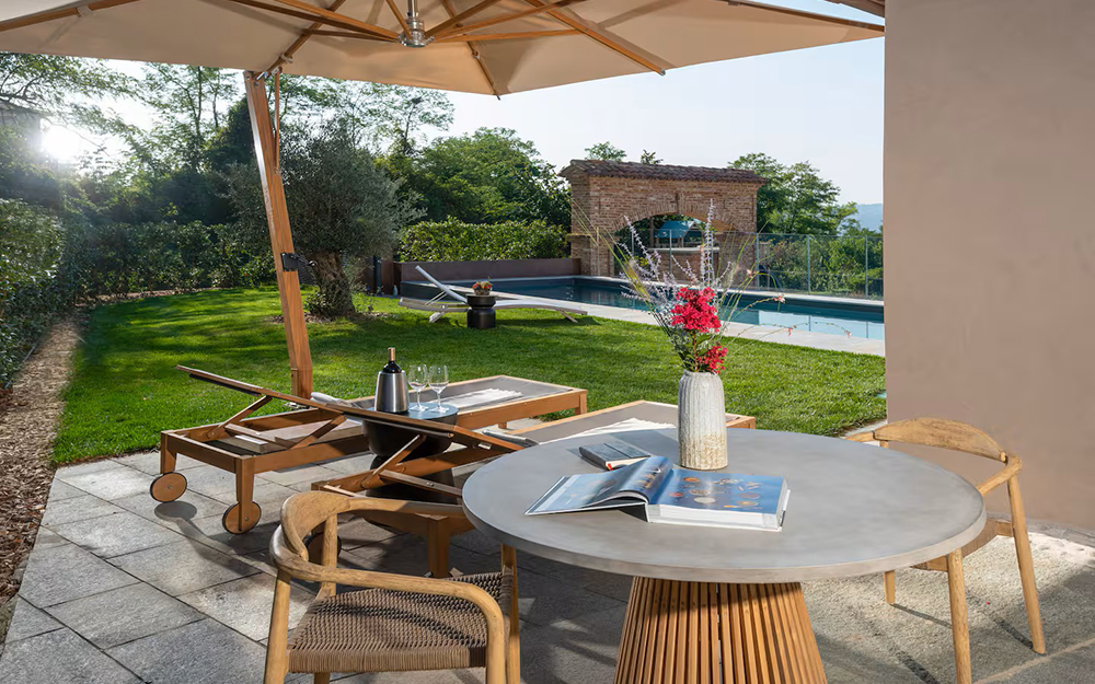 Il giardino privato è perfetto per godersi il sole, con sdraio, ombrellone e un tavolo con sedie per cene all’aperto.