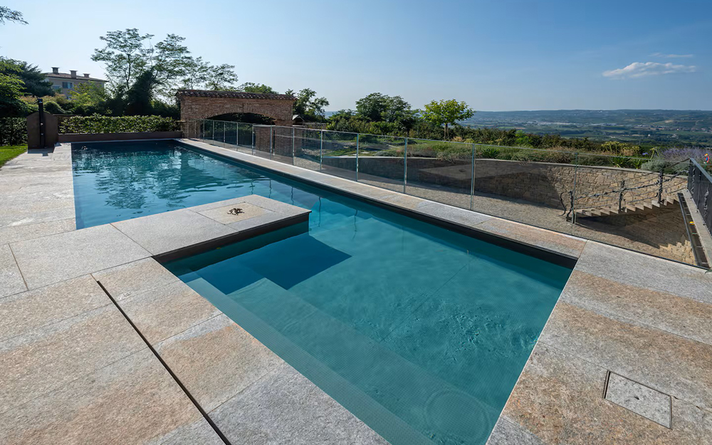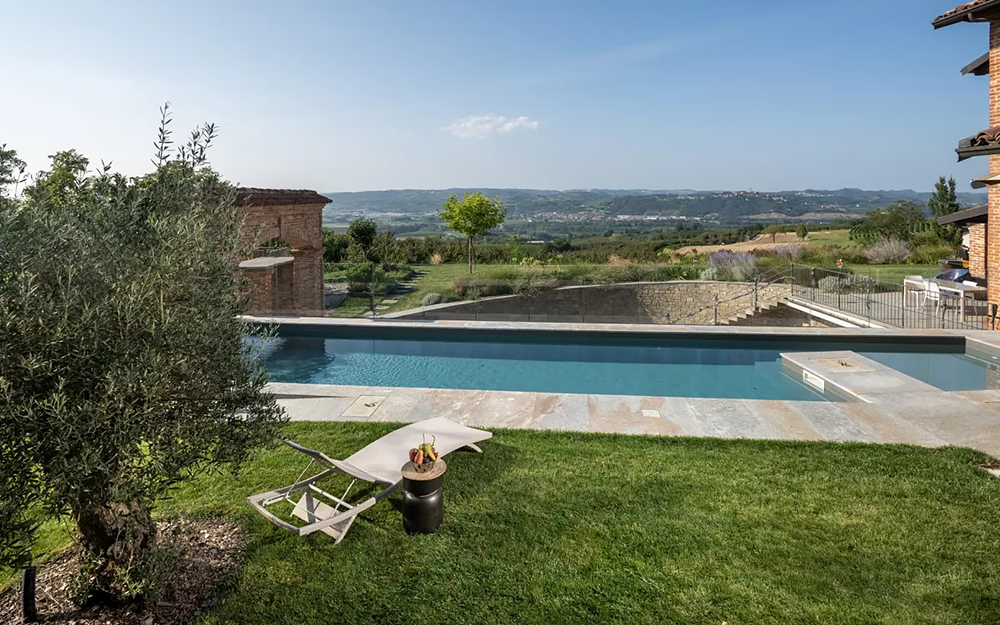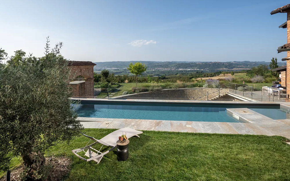 Splendida piscina a sale, con vista mozzafiato sulle Langhe e sul Monviso. Ideale per un tuffo rigenerante in qualsiasi stagione.